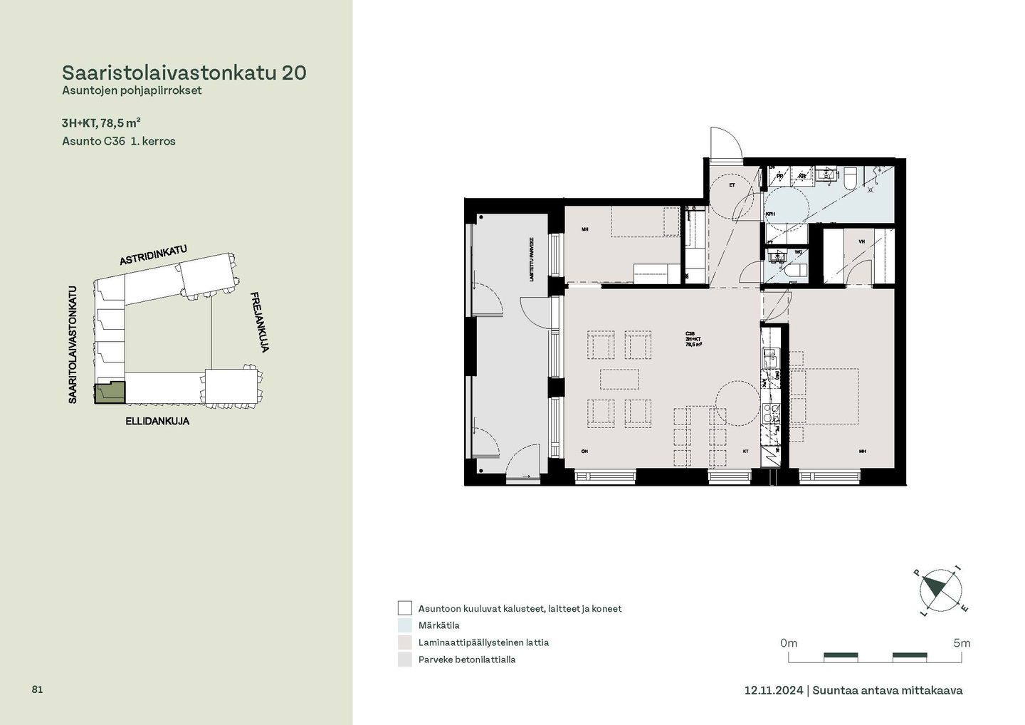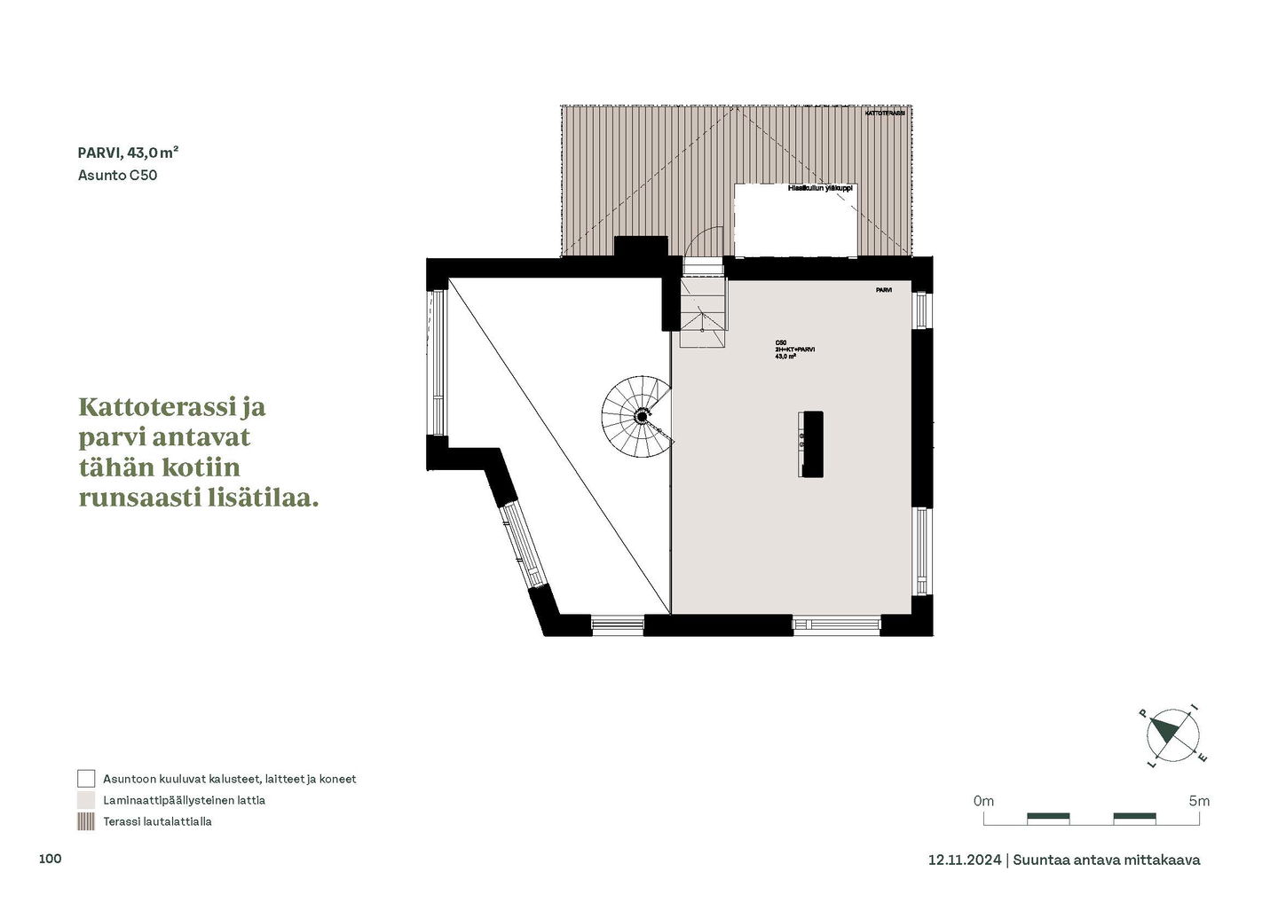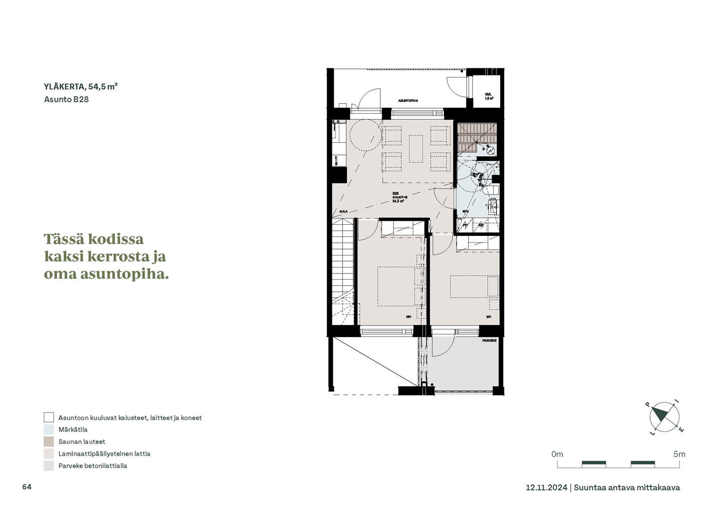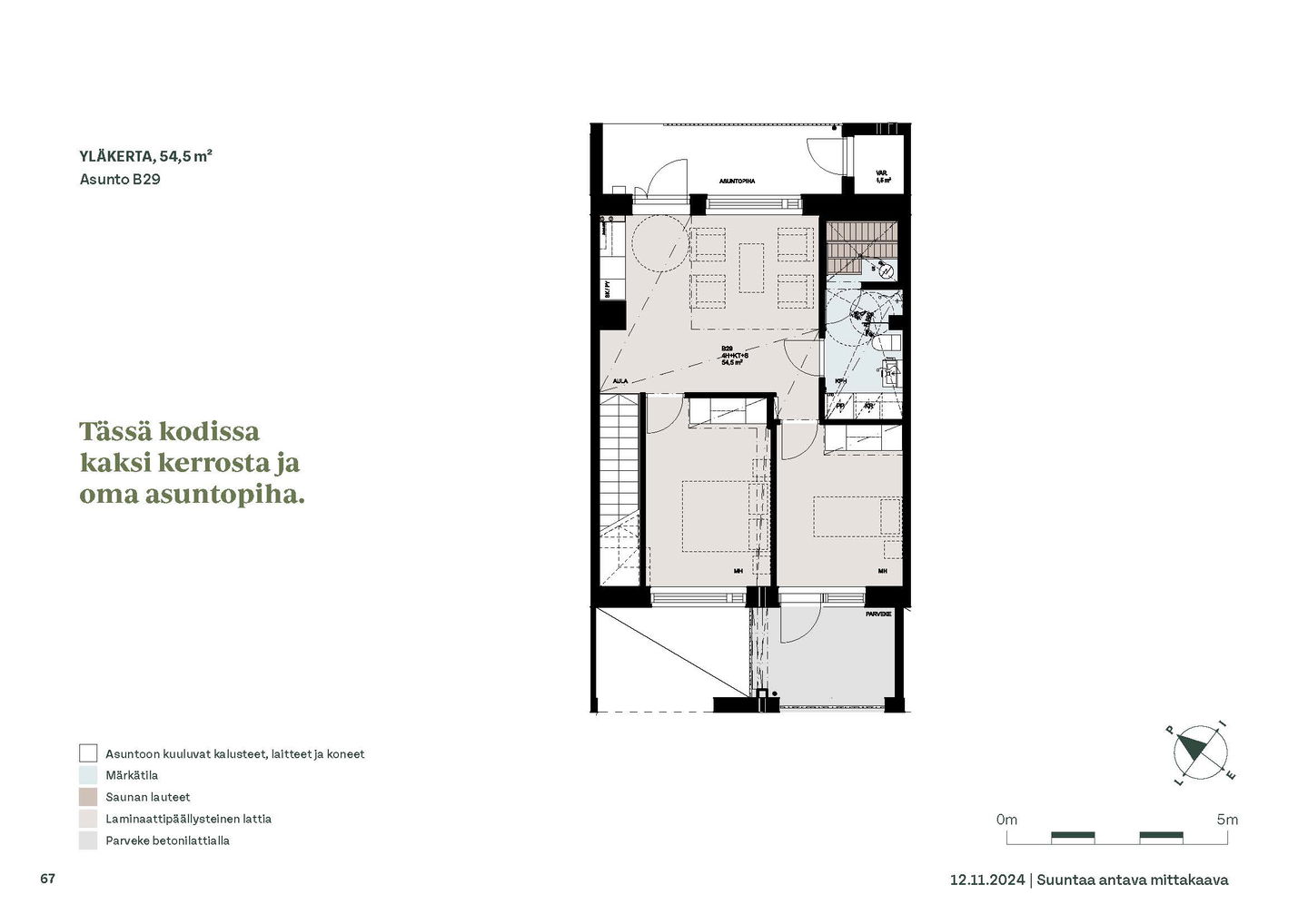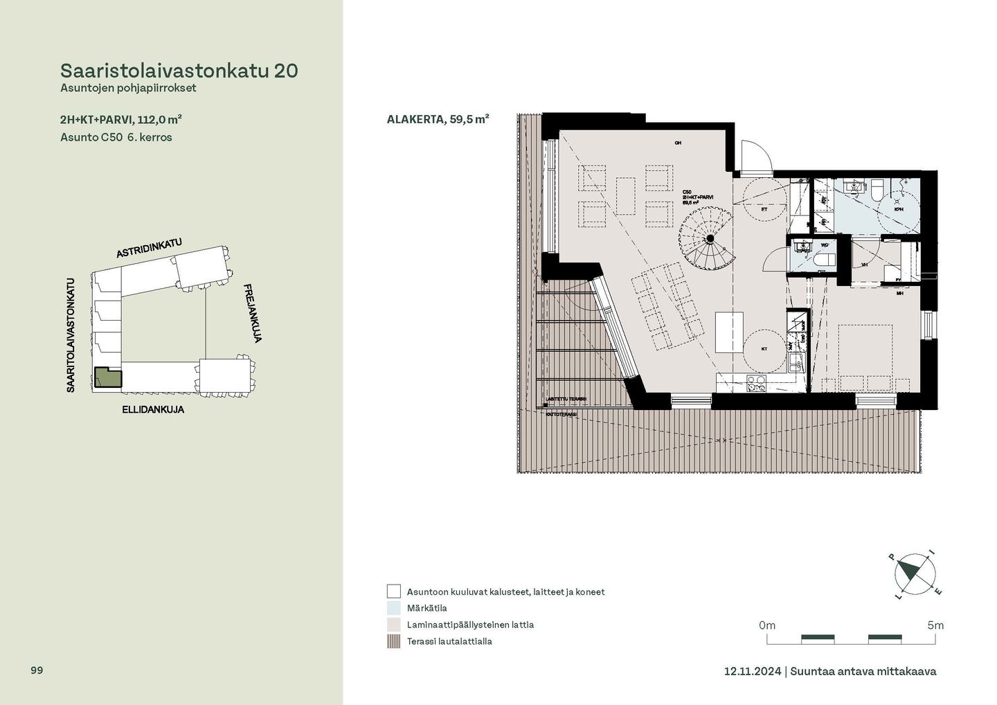 Kaksioista tilaviin, viiden huoneen asuntoihin vaihtelevissa kodeissa on useita erilaisia asuntopohjia, jotka inspiroivat kokenuttakin sisustajaa. Kaikissa asunnoissa on lasitetut parvekkeet tai terassit ja keittiön varusteluun sisältyy astianpesukone. Kodit kylpevät luonnonvalossa ja ylimmistä kerroksista löytyvät tämän kohteen helmet: kaksikerroksiset parviasunnot, joissa on koko huoneiston levyinen parveke sekä kattoterassi. Osassa koteja on oma sauna ja ikkuna myös kylpyhuoneessa, sekä muutamissa pihatason kodeissa istutusten ympäröimät lasitetut terassit.