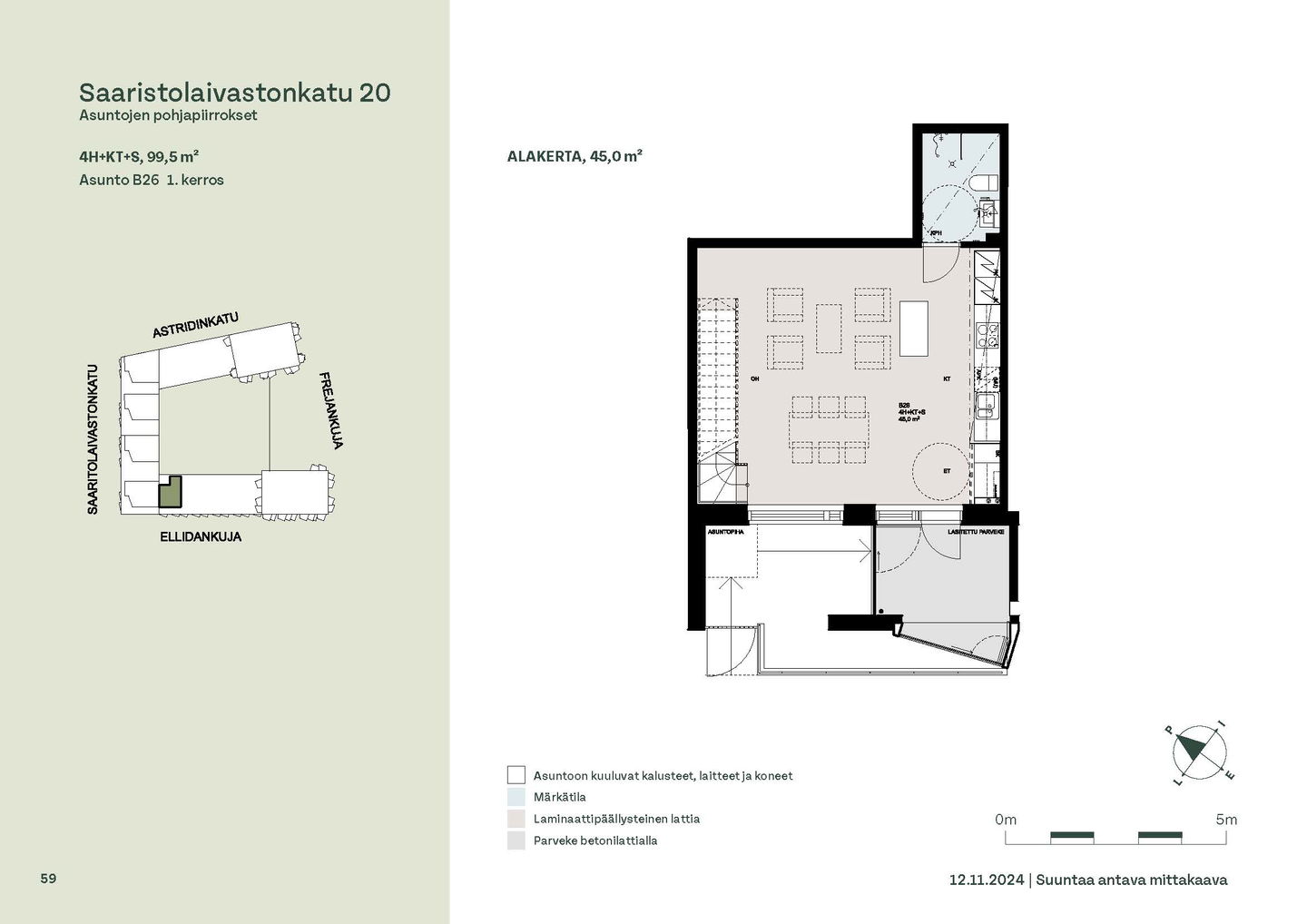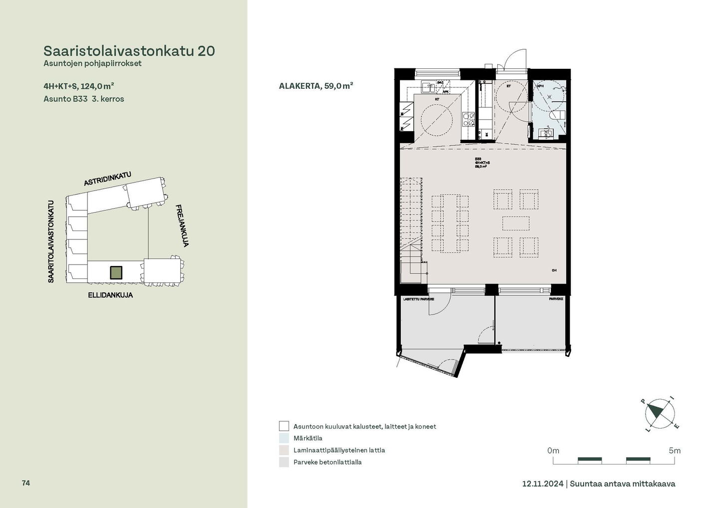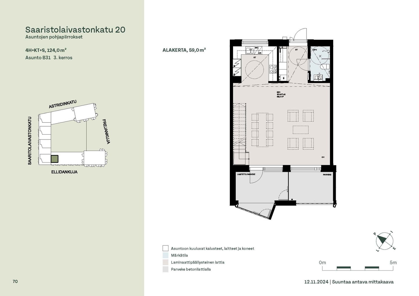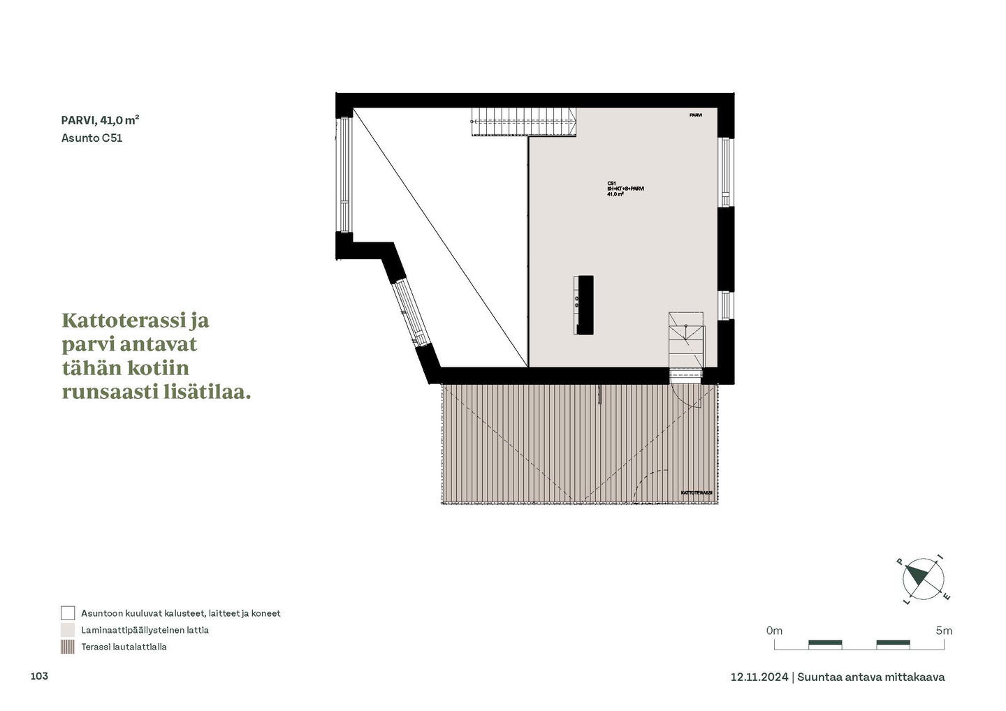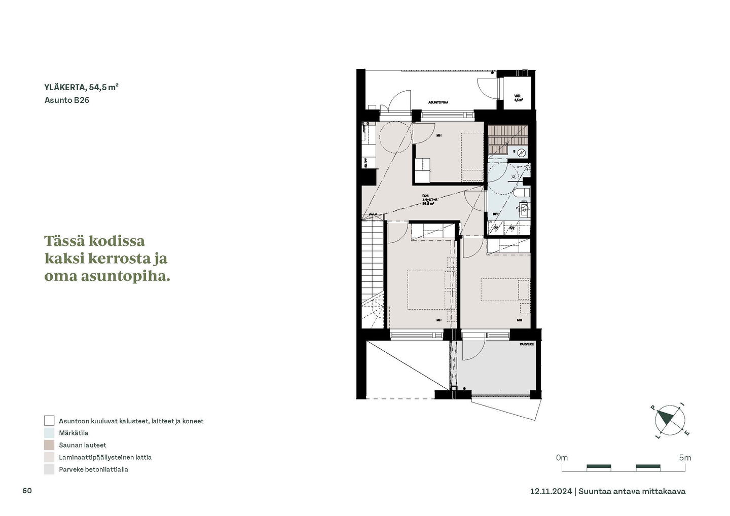 Kaksioista tilaviin, viiden huoneen asuntoihin vaihtelevissa kodeissa on useita erilaisia asuntopohjia, jotka inspiroivat kokenuttakin sisustajaa. Kaikissa asunnoissa on lasitetut parvekkeet tai terassit ja keittiön varusteluun sisältyy astianpesukone. Kodit kylpevät luonnonvalossa ja ylimmistä kerroksista löytyvät tämän kohteen helmet: kaksikerroksiset parviasunnot, joissa on koko huoneiston levyinen parveke sekä kattoterassi. Osassa koteja on oma sauna ja ikkuna myös kylpyhuoneessa, sekä muutamissa pihatason kodeissa istutusten ympäröimät lasitetut terassit.