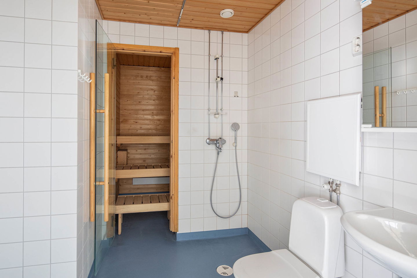 Asunnossa on käytännöllinen ja toimiva pohjaratkaisu. Tilava olohuone yhdistyy mukavasti ruokailutilaan ja keittiöön, ja makuuhuoneessa on mukavasti säilytystilaa. Kylpyhuoneesta löytyy oma sauna.