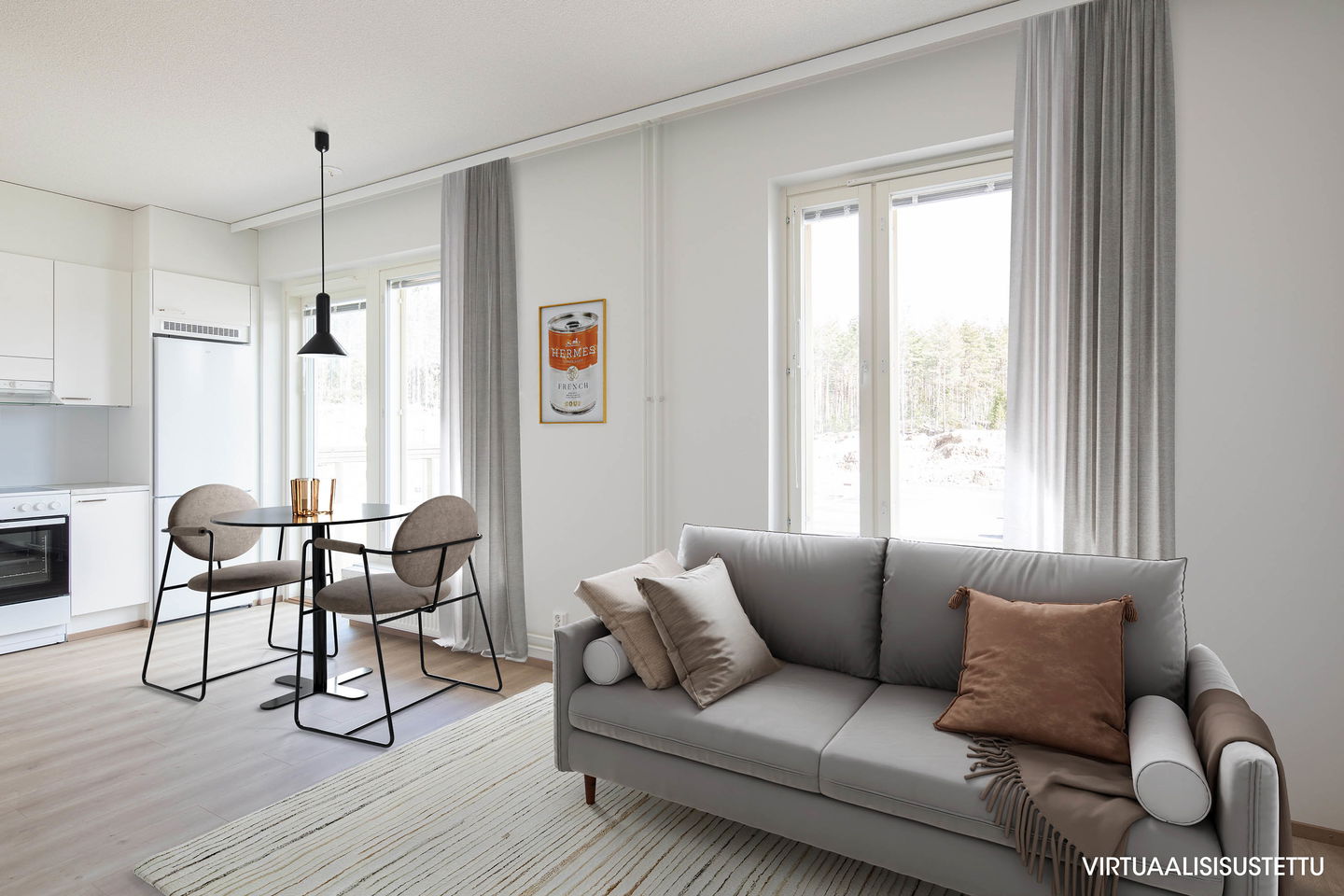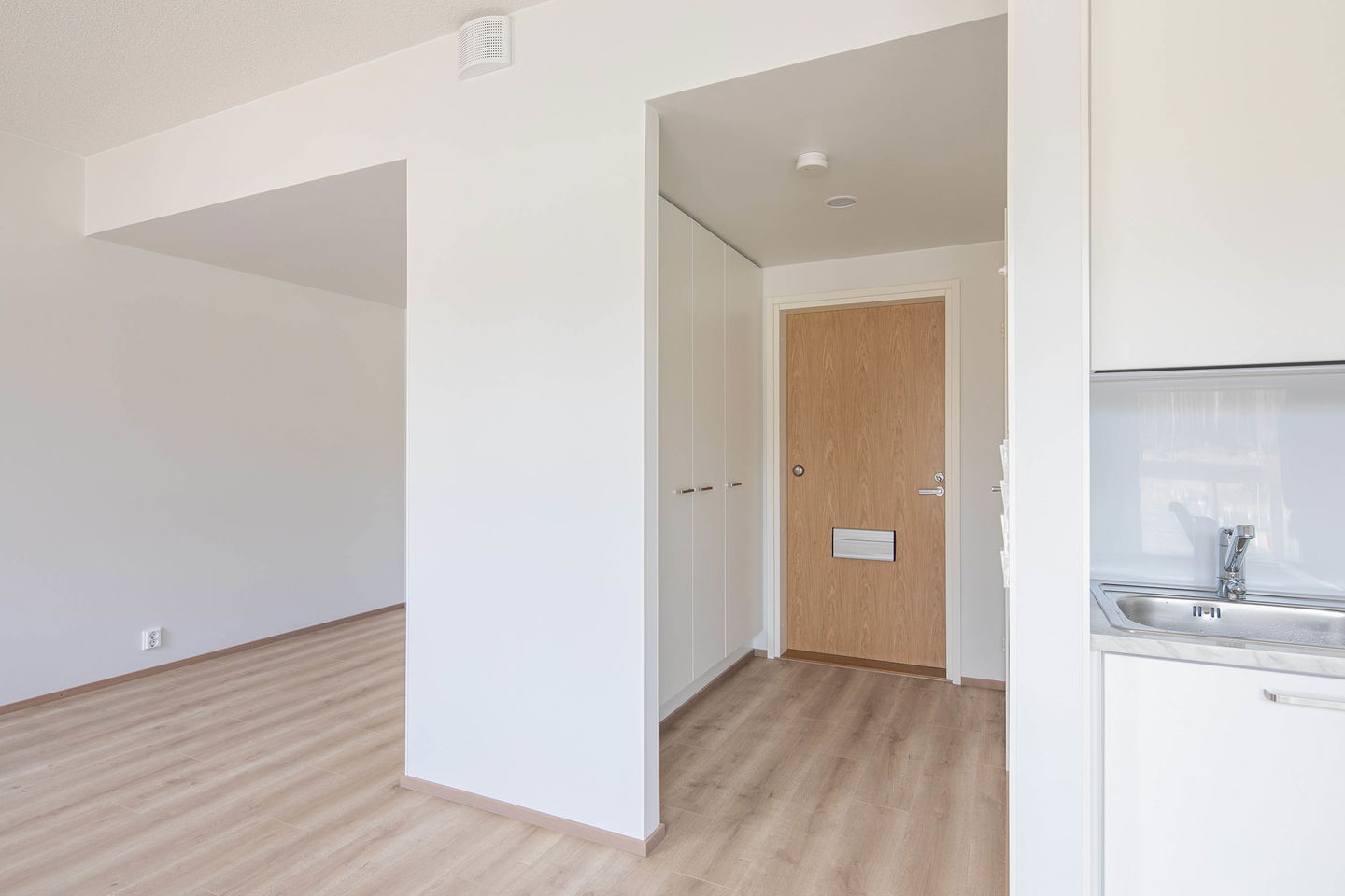 Hyvin sijoiteltu keittiönurkkaus tarjoaa käytännöllisen tilan ruuanlaittoon. Alkovin voit erottaa omaksi nukkumatilaksi verhoilla.