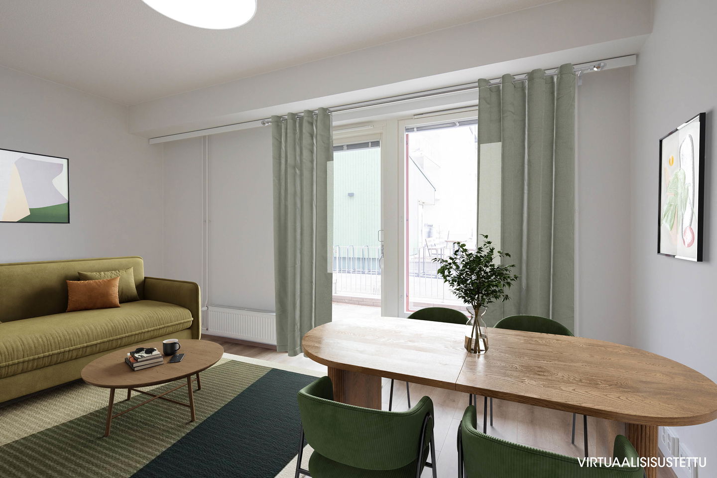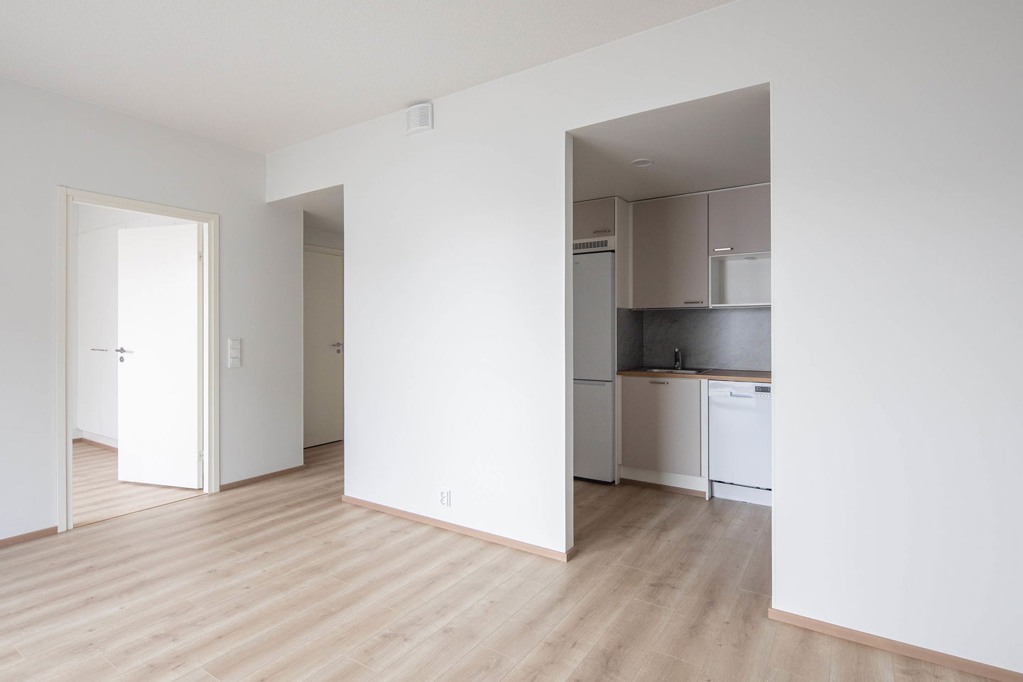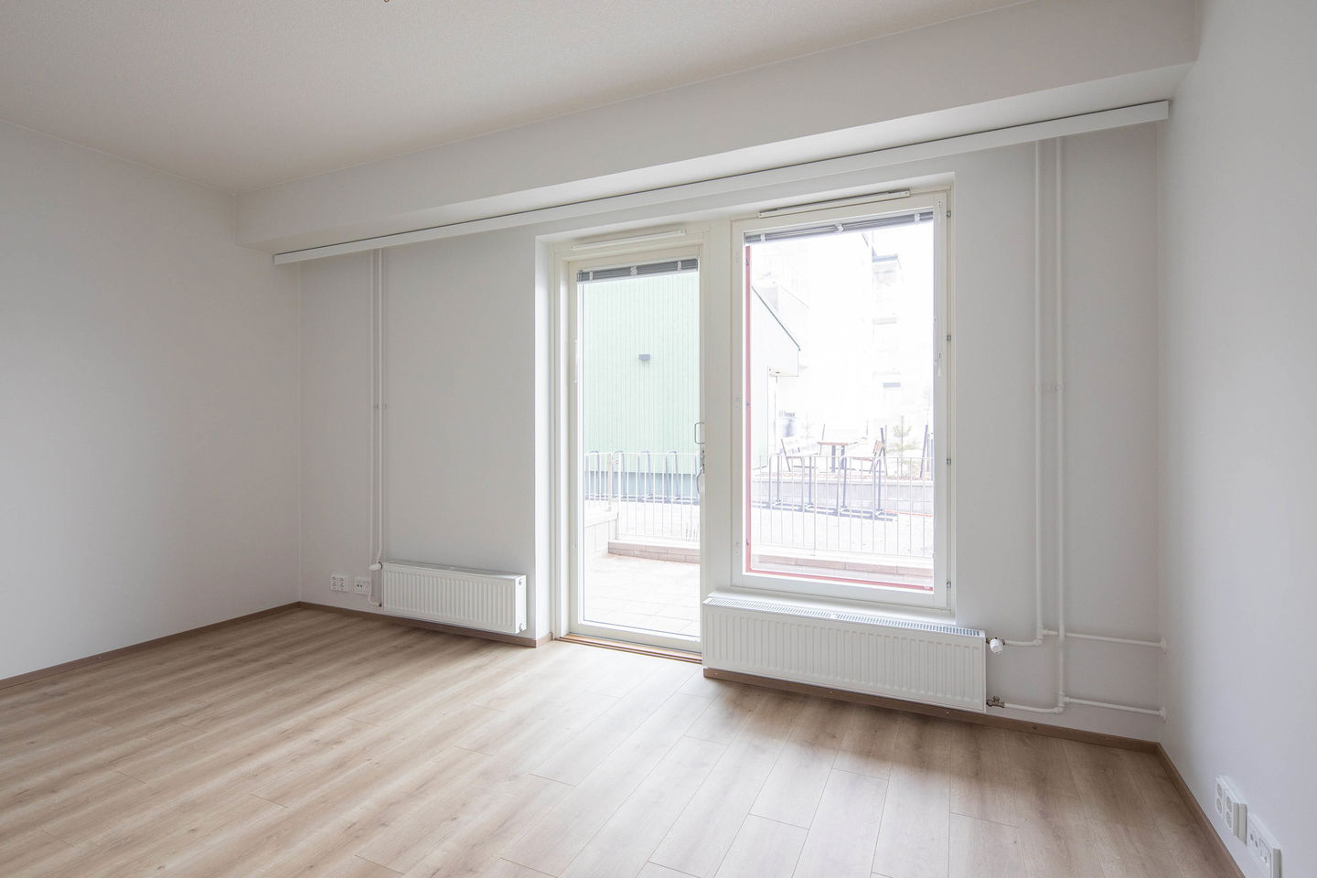 Heti muuttovalmis, valoisa kaksio. Suurella, lähes asunnon pituisella terassilla on mukava rentoutua työpäivän päätteeksi.