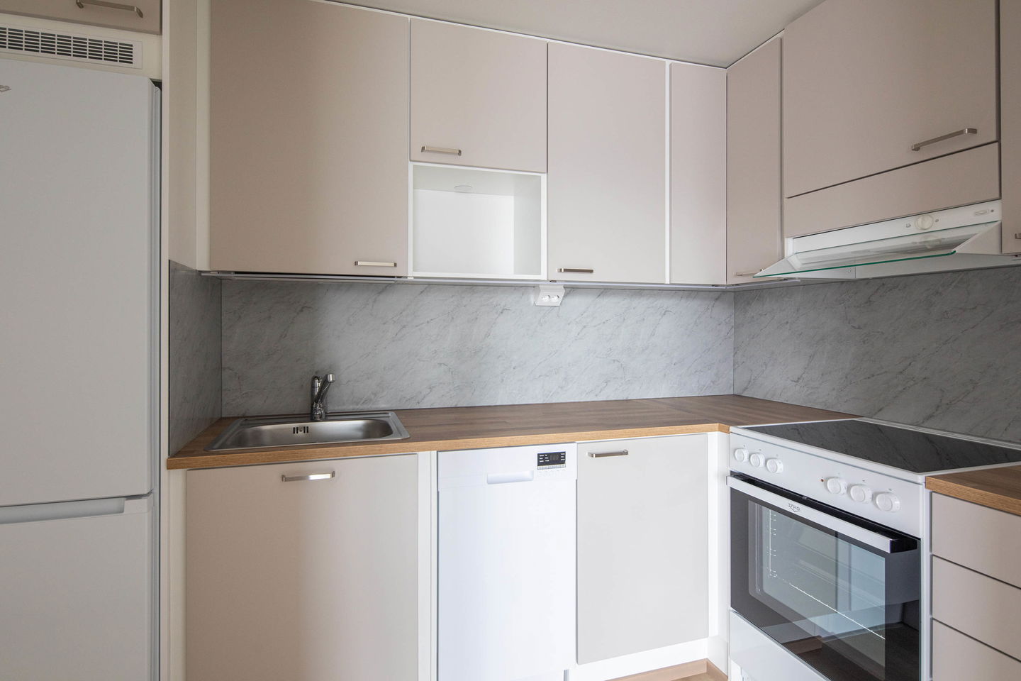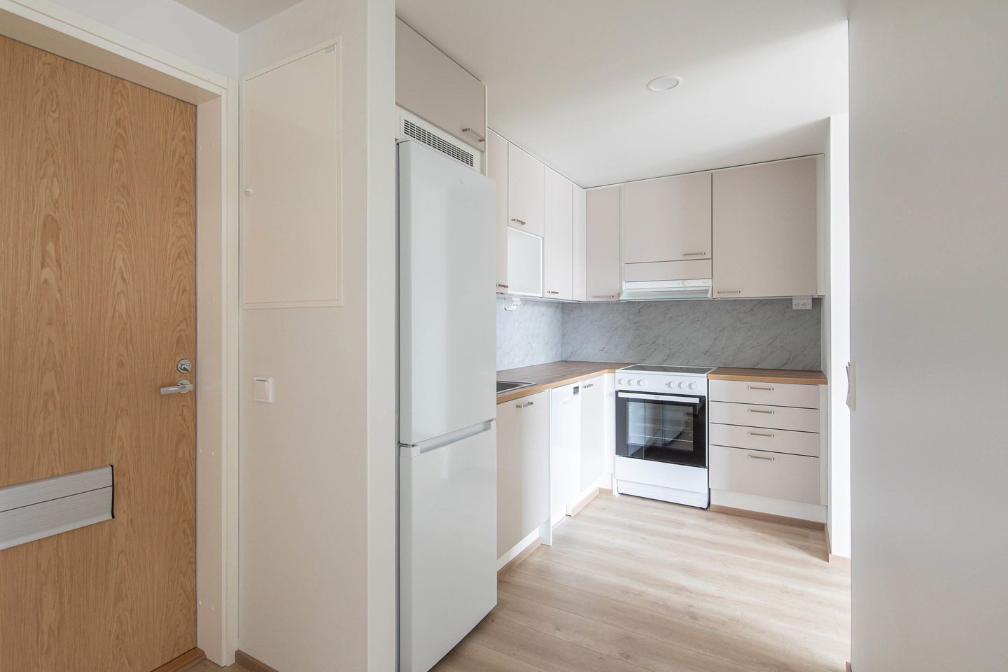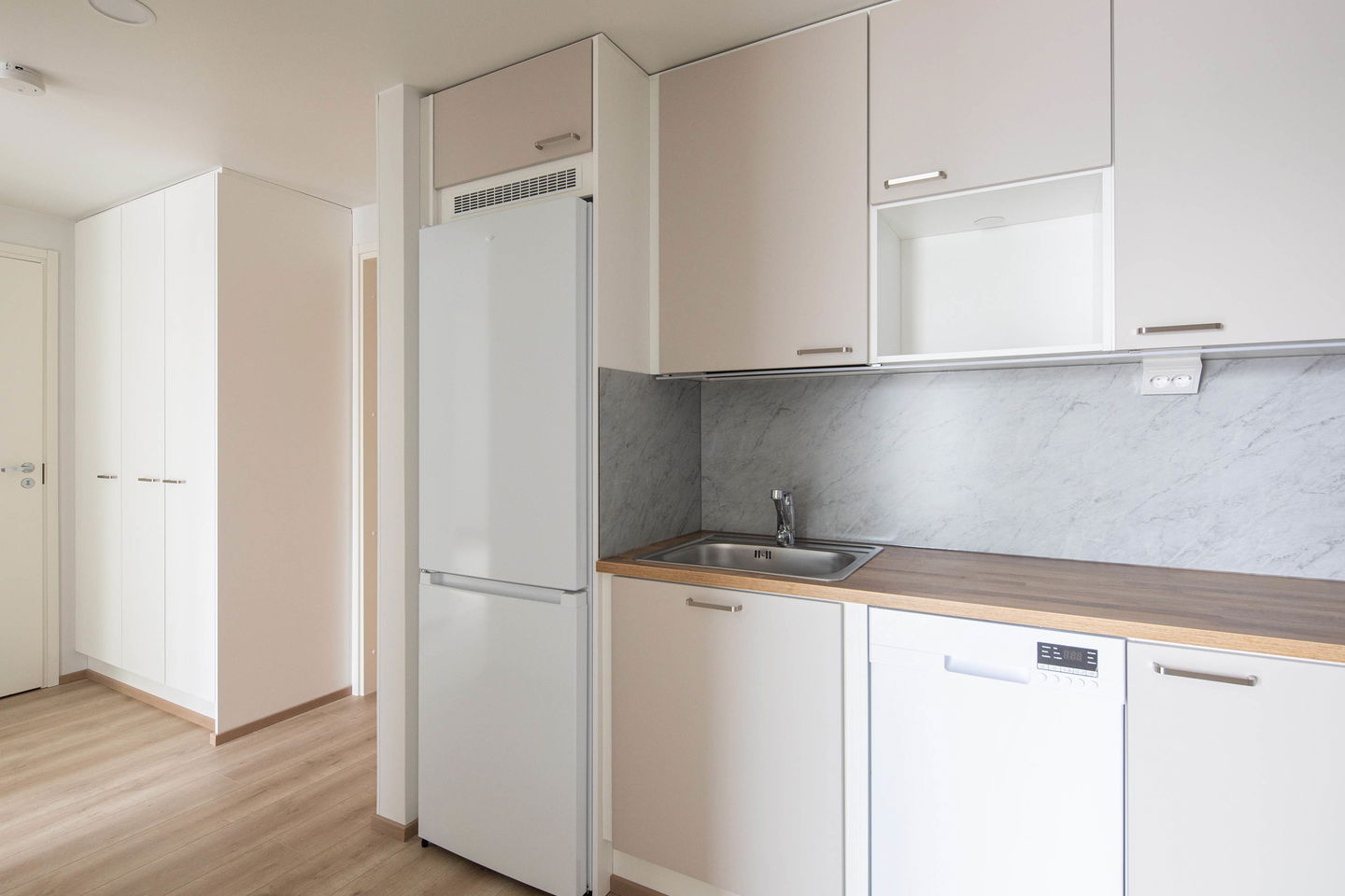 Heti muuttovalmis, valoisa kaksio. Suurella, lähes asunnon pituisella terassilla on mukava rentoutua työpäivän päätteeksi.