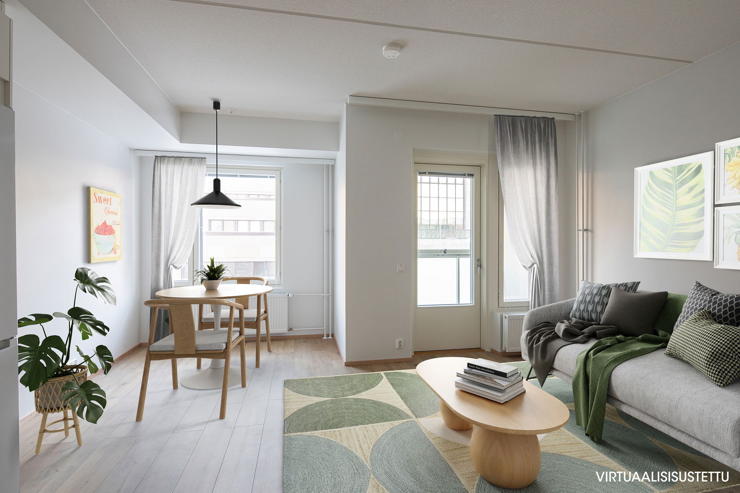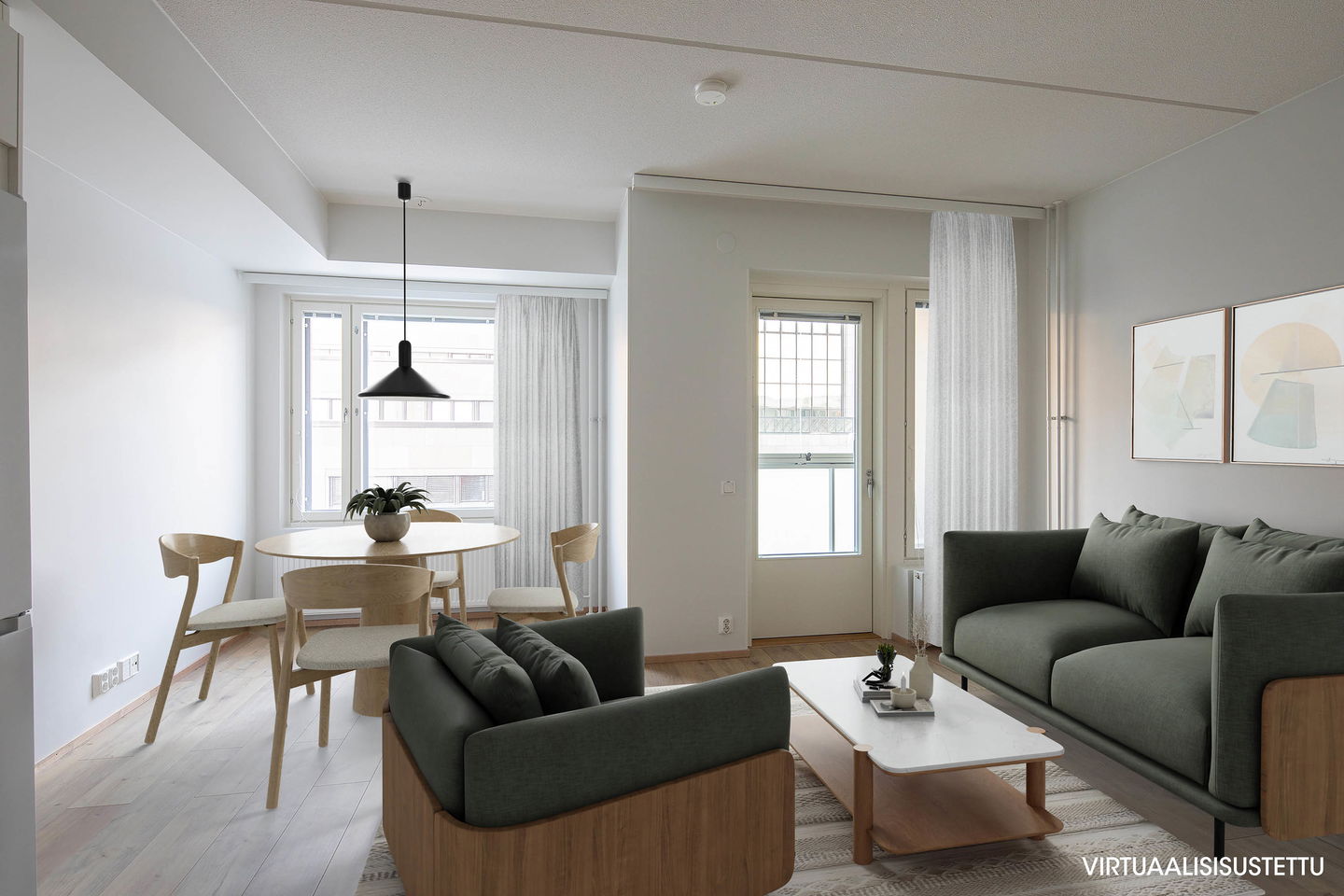 Keittiö on yhtenäistä tilaa olohuoneen kanssa ja ruokapöydälle / työpöydälle löytyy oma paikka olohuoneen yhteydessä esimerkiksi ikkunan alta.