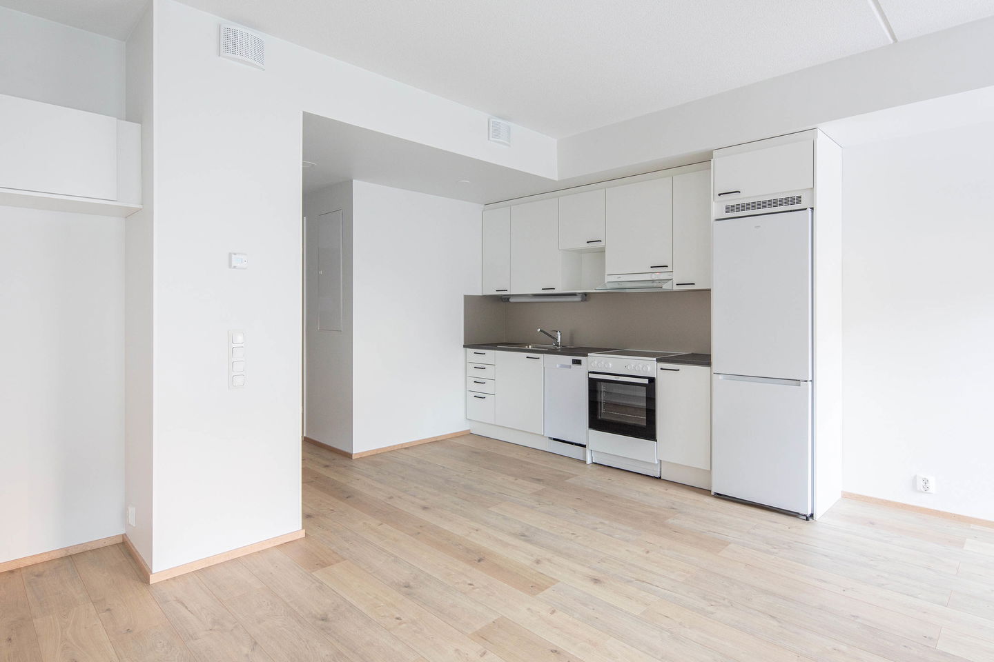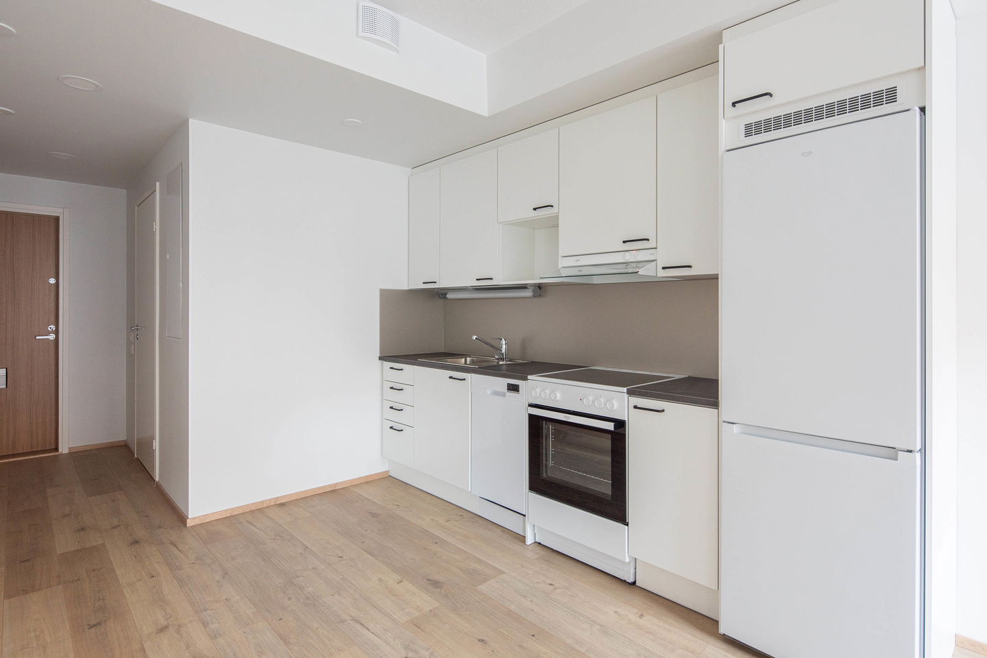 Keittiö on yhtenäistä tilaa olohuoneen kanssa ja ruokapöydälle / työpöydälle löytyy oma paikka olohuoneen yhteydessä esimerkiksi ikkunan alta.