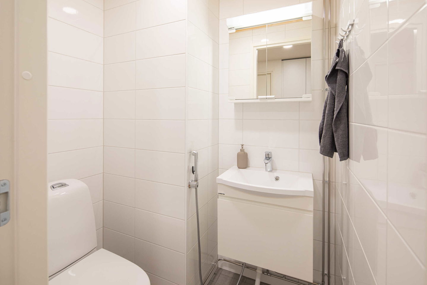 Asunnossa on kylpyhuoneen lisäksi erillinen wc, mikä helpottaa arkea. Säilytystilaa on vaatehuoneessa sekä kaapistoissa. Lasitettu parveke tuo lisätilaa oleskeluun. Lattiat ovat laminaattia ja märkätilat laatoitettu. Keittiön varustukseen kuuluu astianpesukone, keraaminen liesi ja kylmälaitteet.