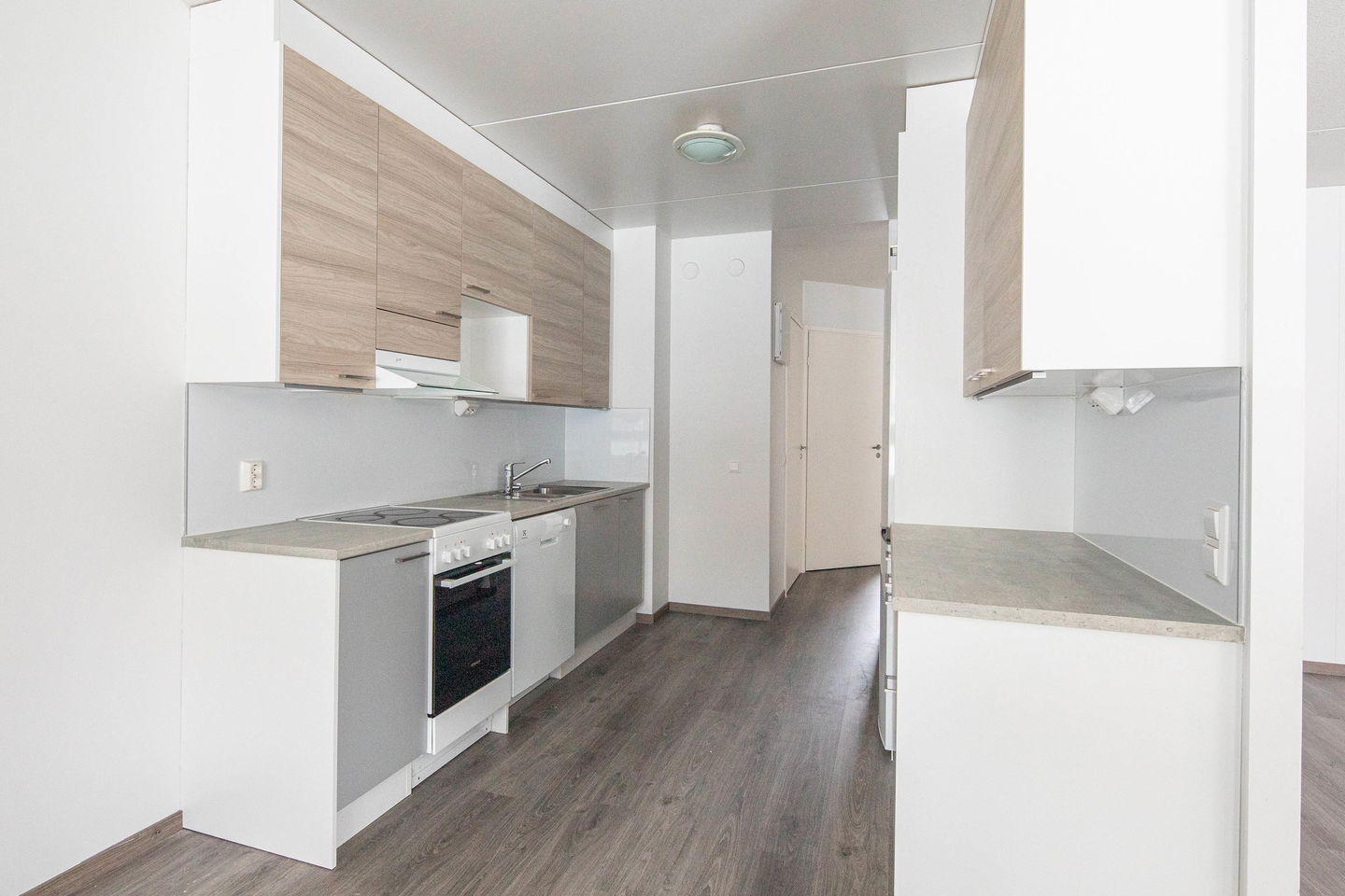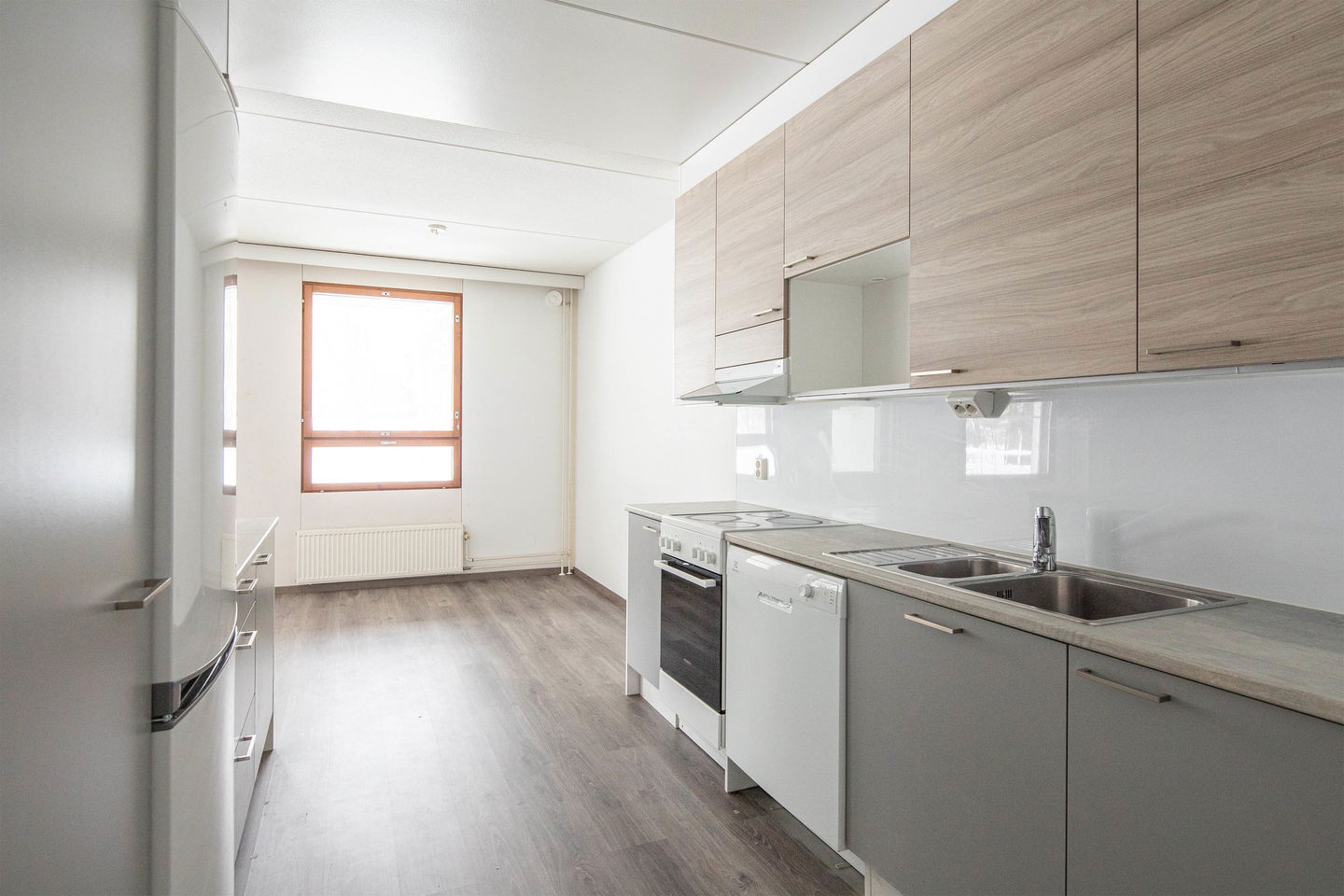 Asunnon sydämenä toimii yhtenäinen olohuone–keittiö–ruokailutila, joka tarjoaa runsaasti tilaa ruokailuun ja yhdessäoloon.