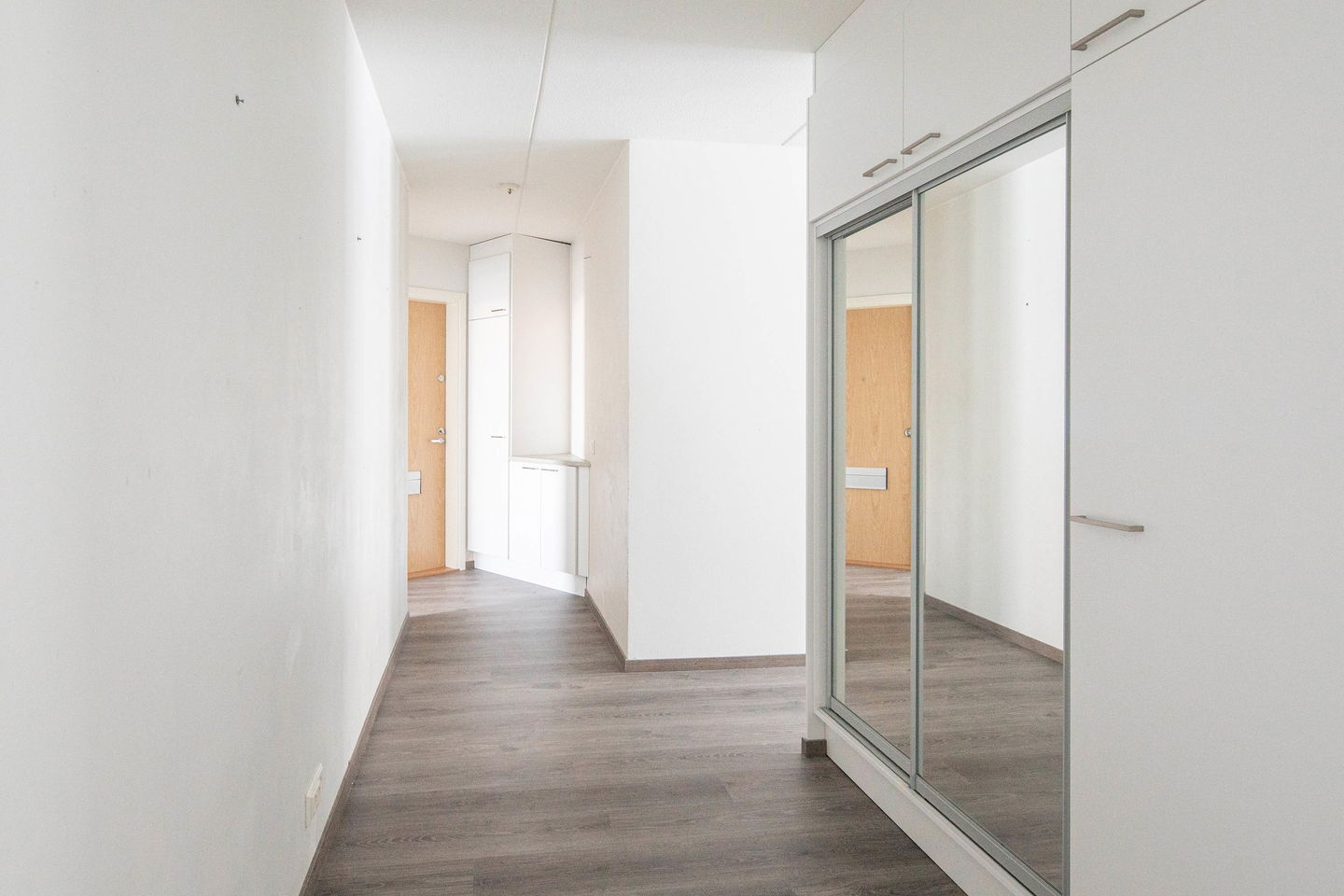 Asunnossa on kaksi erillistä makuuhuonetta, joissa molemmissa on säilytystilaa. Tilava eteinen avautuu suoraan asunnon avaraan keskiosaan, mikä lisää tilan tuntua heti sisään astuttaessa.