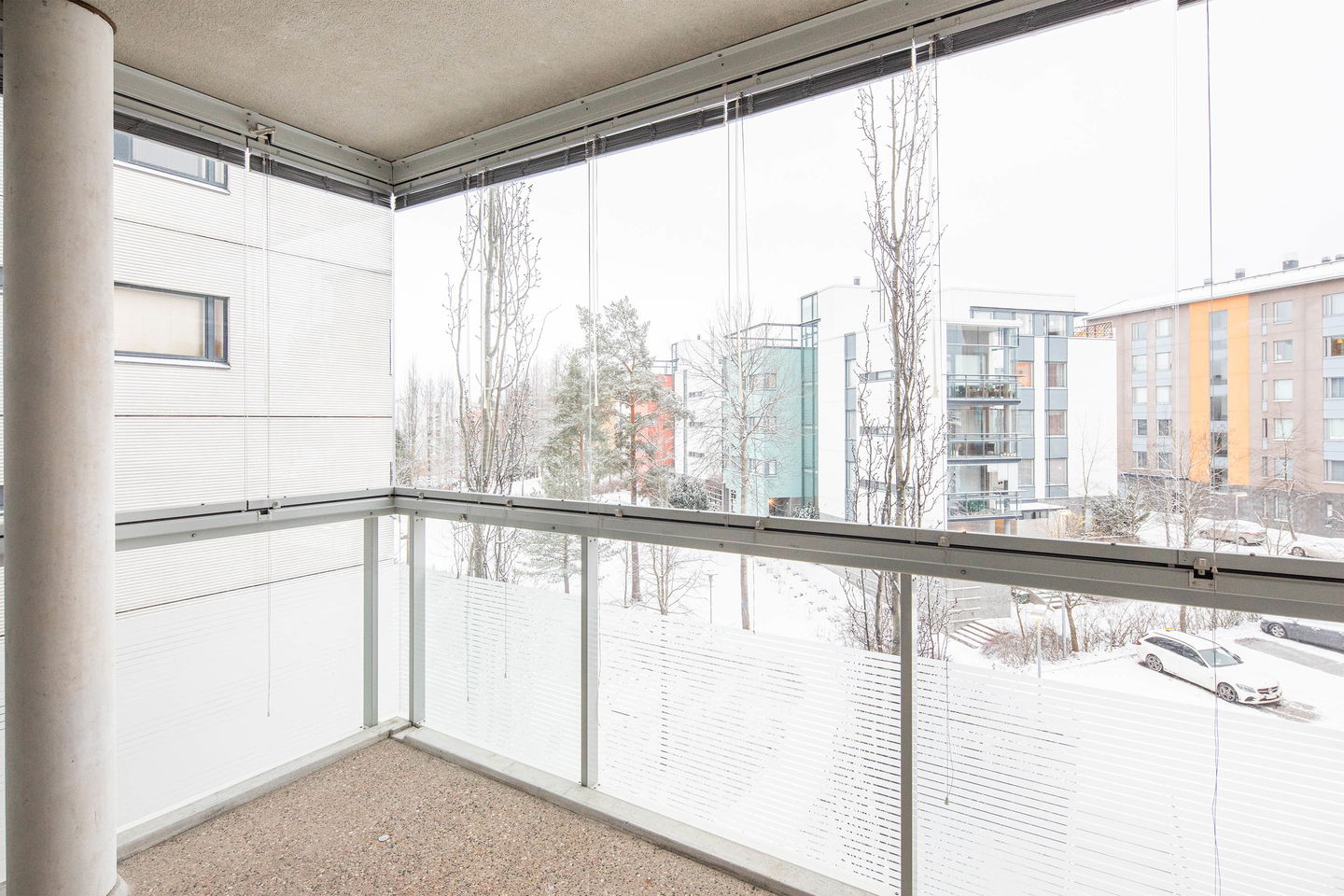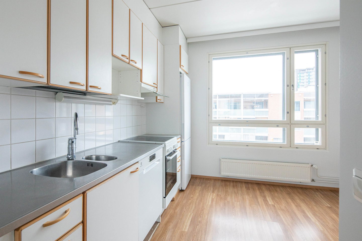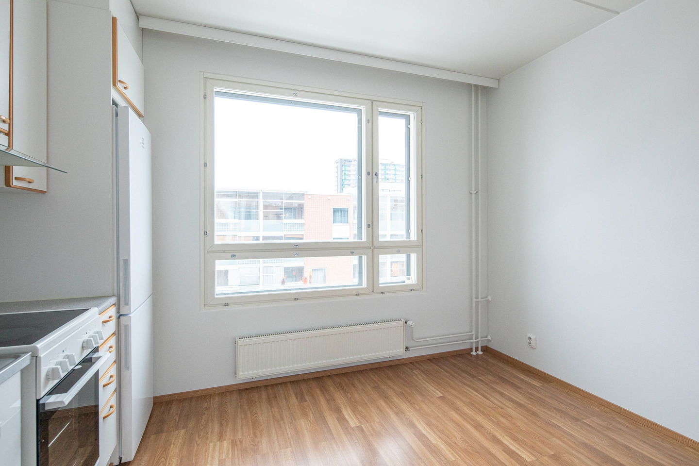 Tilava kolmio, jossa keittiössä hyvin kaappitilaa ja ruokapöydälle paikka. Olohuoneesta käynti lasitetulle parvekkeelle, jossa kaihtimet.
