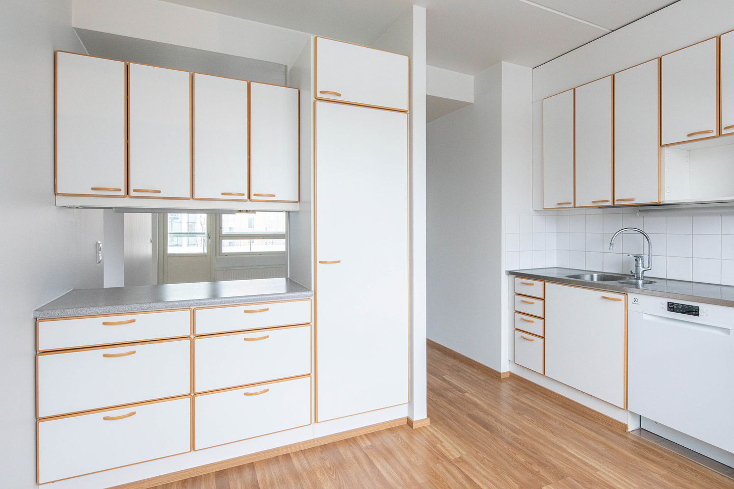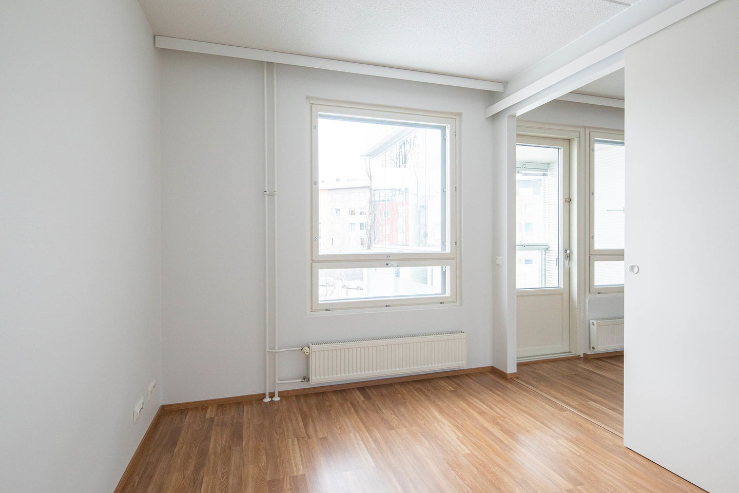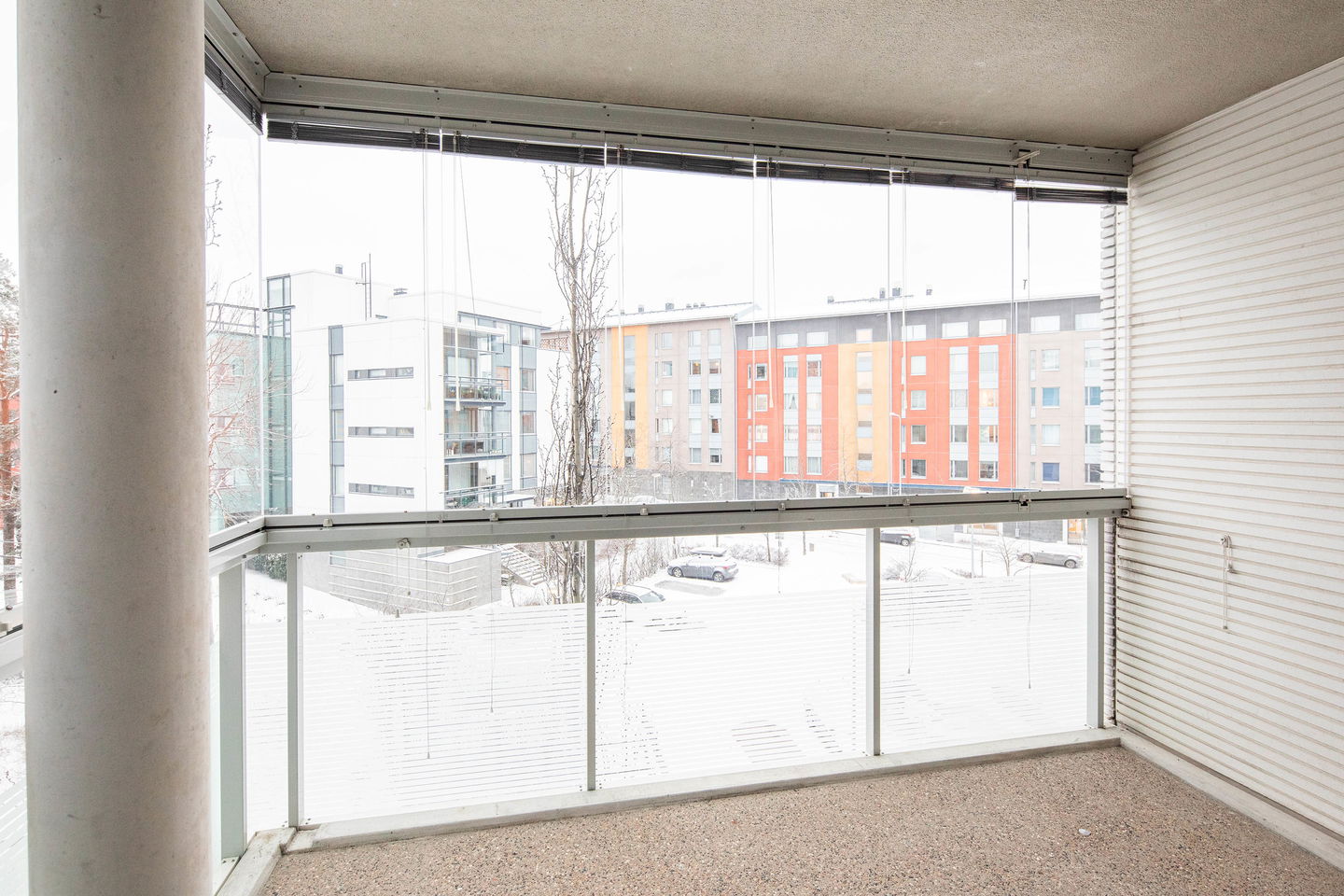 Tilava kolmio, jossa keittiössä hyvin kaappitilaa ja ruokapöydälle paikka. Olohuoneesta käynti lasitetulle parvekkeelle, jossa kaihtimet.