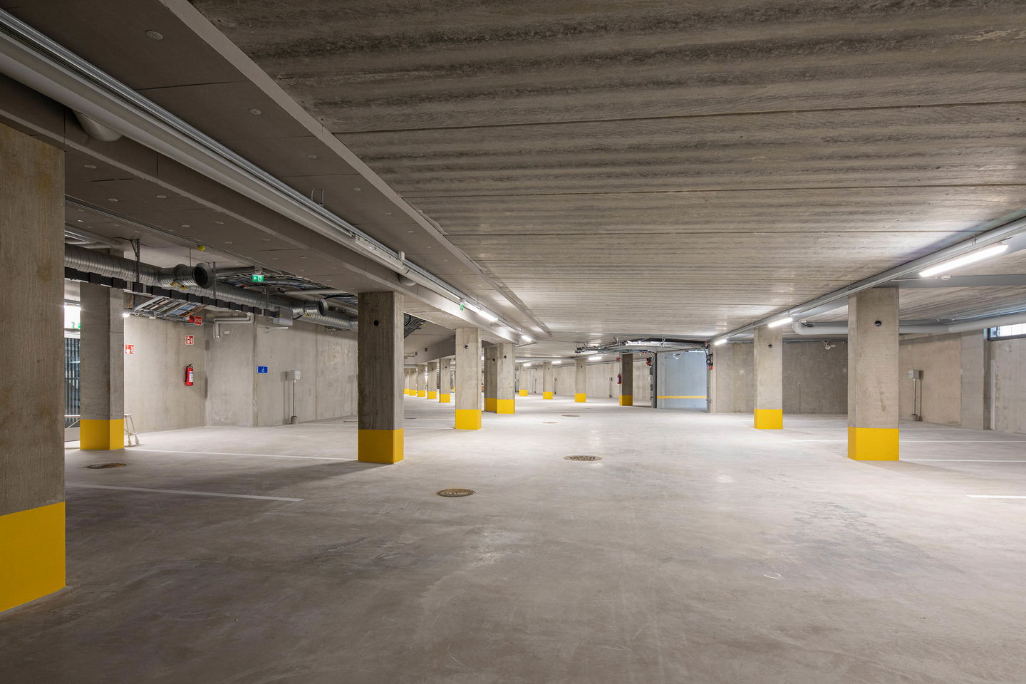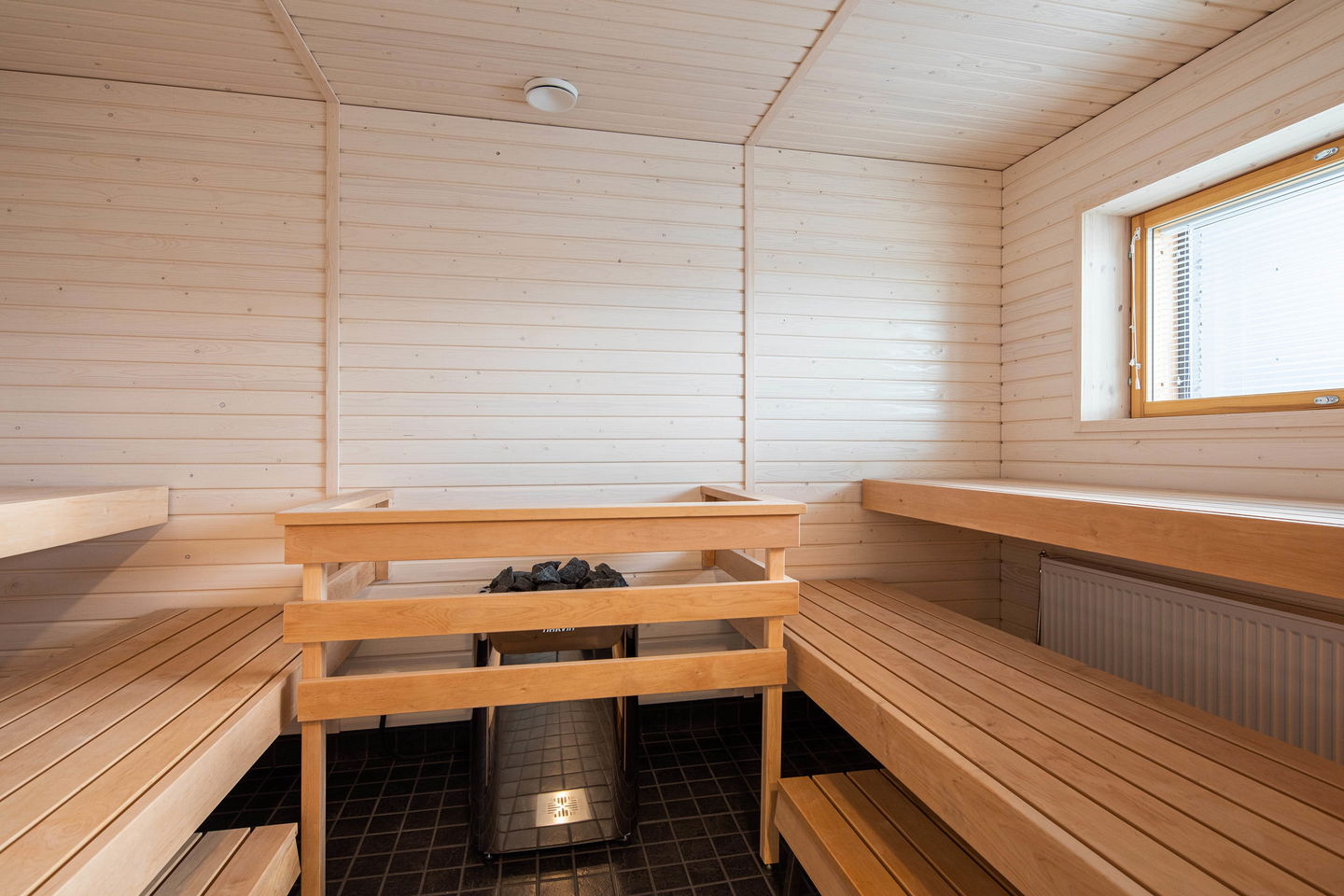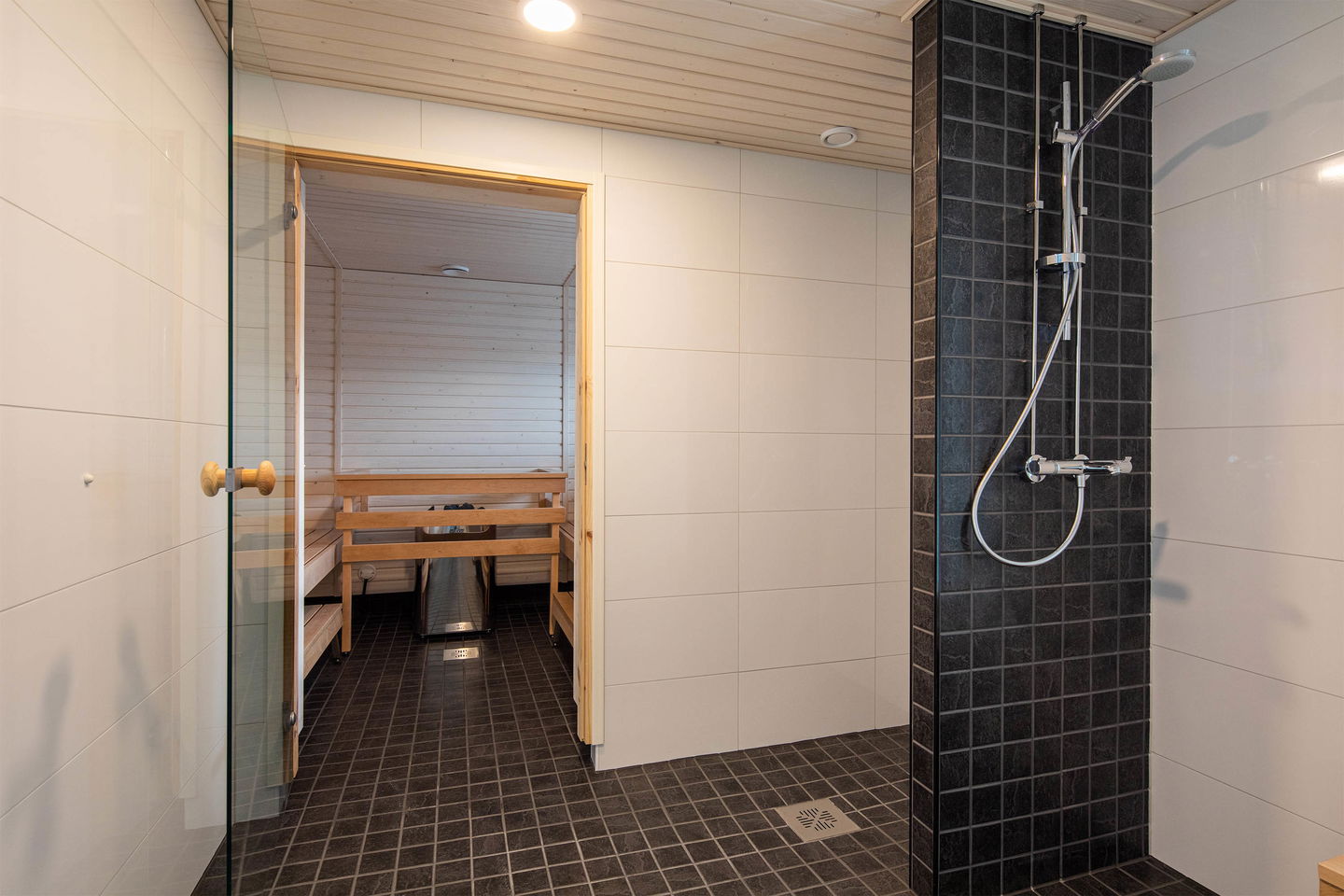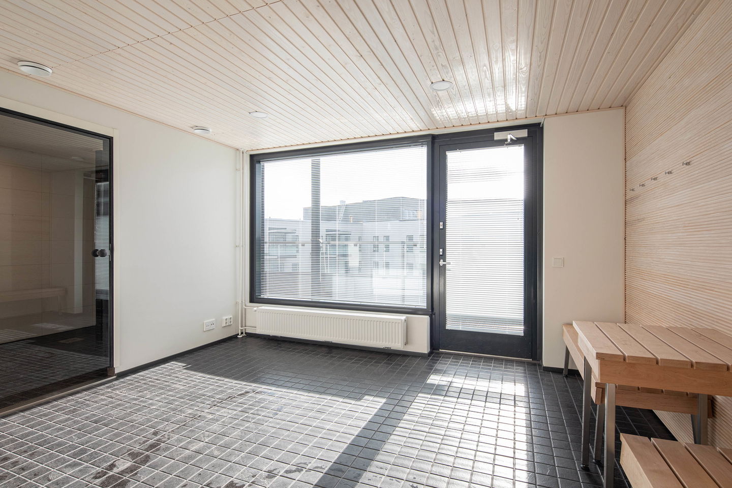 Talossa on hissi ja upeat saunatilat ylimmässä kerroksessa kattoterasseineen. Autopaikat pysäköintihallissa, jonne kulku oman porraskäytävän hissillä.