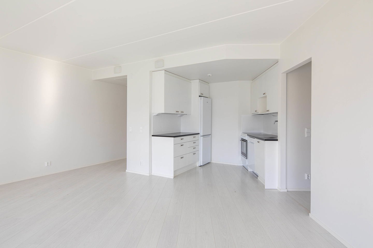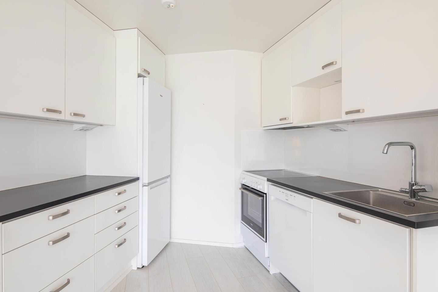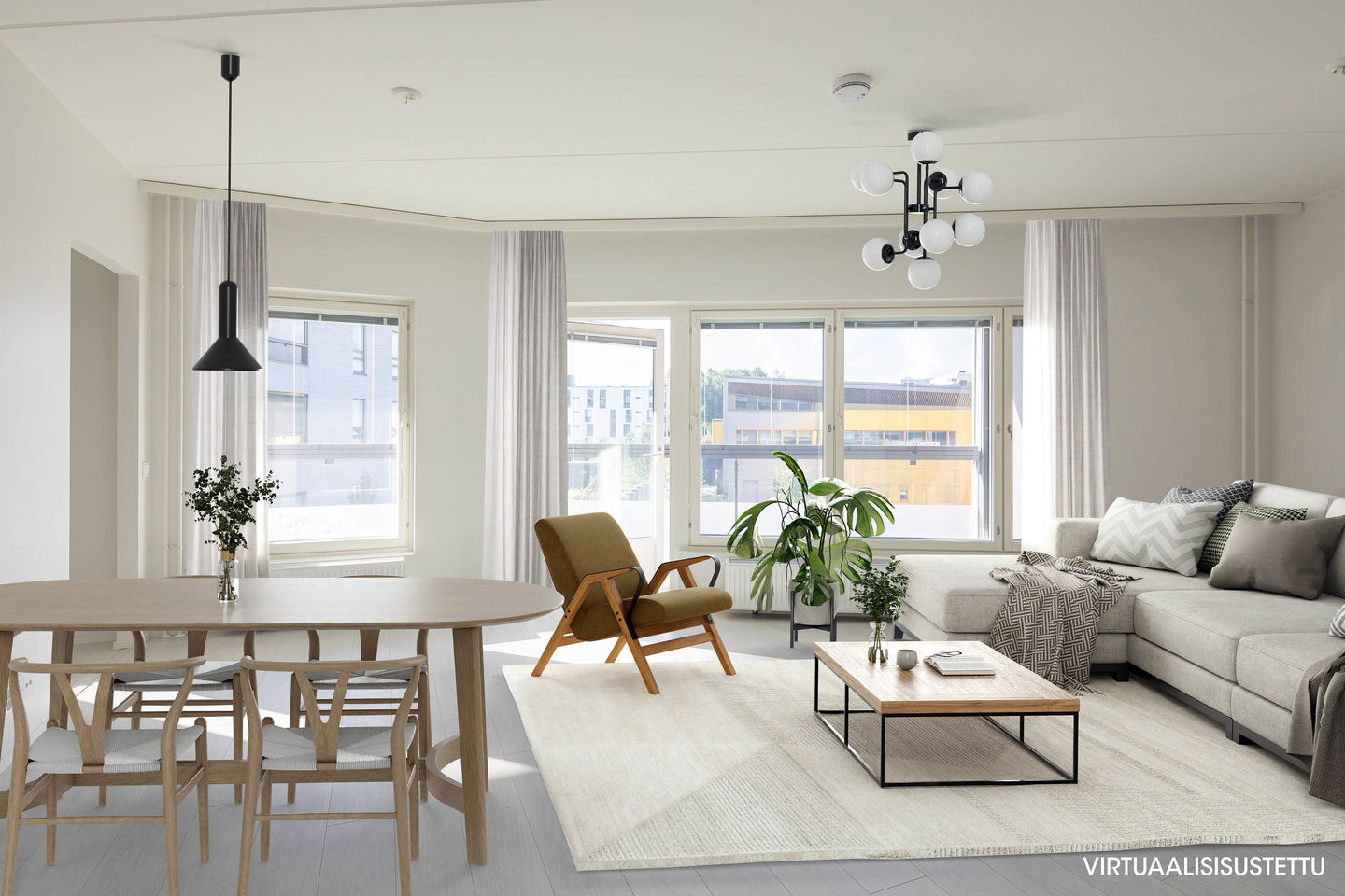 Valoisa kompakti kolmio vaikka pienelle perheelle. Asunnon keittiö aukeaa olohuoneeseen ja mahdollistaa seurustelun arjessa ja juhlassa ruuanlaiton ohessa.