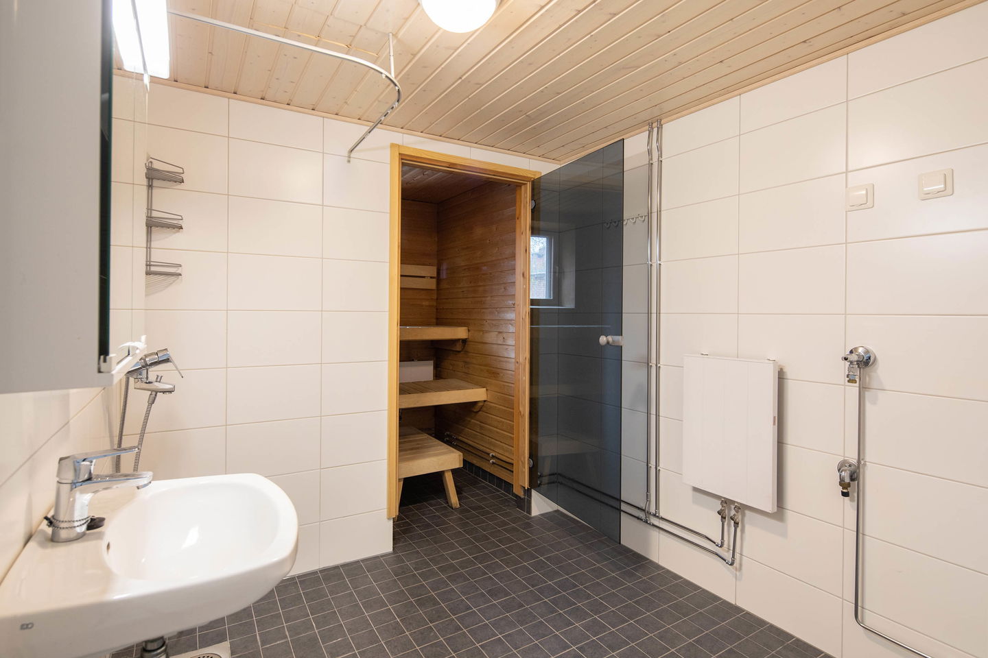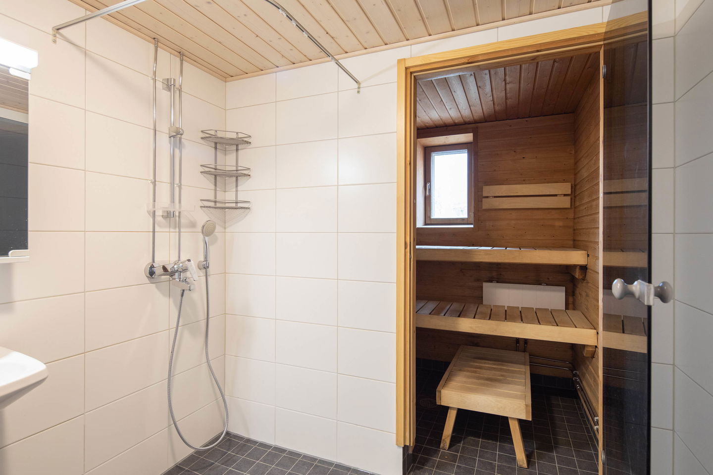 Kodin toimivuutta lisää se, että sekä ylä- että alakerrassa on erilliset wc:t, mikä tekee arjen sujuvaksi perheelle. Alakerrasta löytyy myös tilava ja siisti kylpyhuone, jonka yhteydessä sauna. Kylpyhuoneesta löytyy tilaa niin pyykinpesukoneelle kuin kuivausrummullekin.