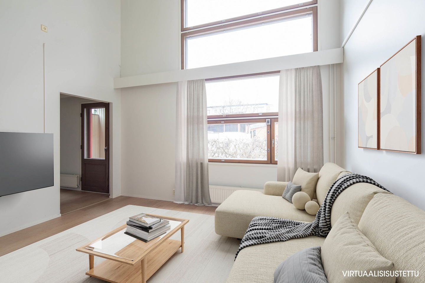Tervetuloa tutustumaan tähän hyvin pidettyyn perheasuntoon Malminkartanossa! Olohuoneessa on hulppea viiden metrin huonekorkeus ja lähes lattiasta kattoon olevat ikkunat jotka tuovat runsaasti luonnonvaloa asuntoon. Alakerrassa on runsaasti kaappitilaa niin eteisessä kuin keittiössäkin, mikä tekee arjen säilytyksestä helppoa. Tilava keittiö tarjoaa mukavasti tilaa ruokapöydälle, ja alakerran makuuhuoneesta on suora käynti aidatulle ja helppohoitoiselle pihalle, jossa on myös käytännöllinen ulkovarasto. Makuuhuone toimii tarvittaessa myös erinomaisesti työ- tai harrastehuoneena.