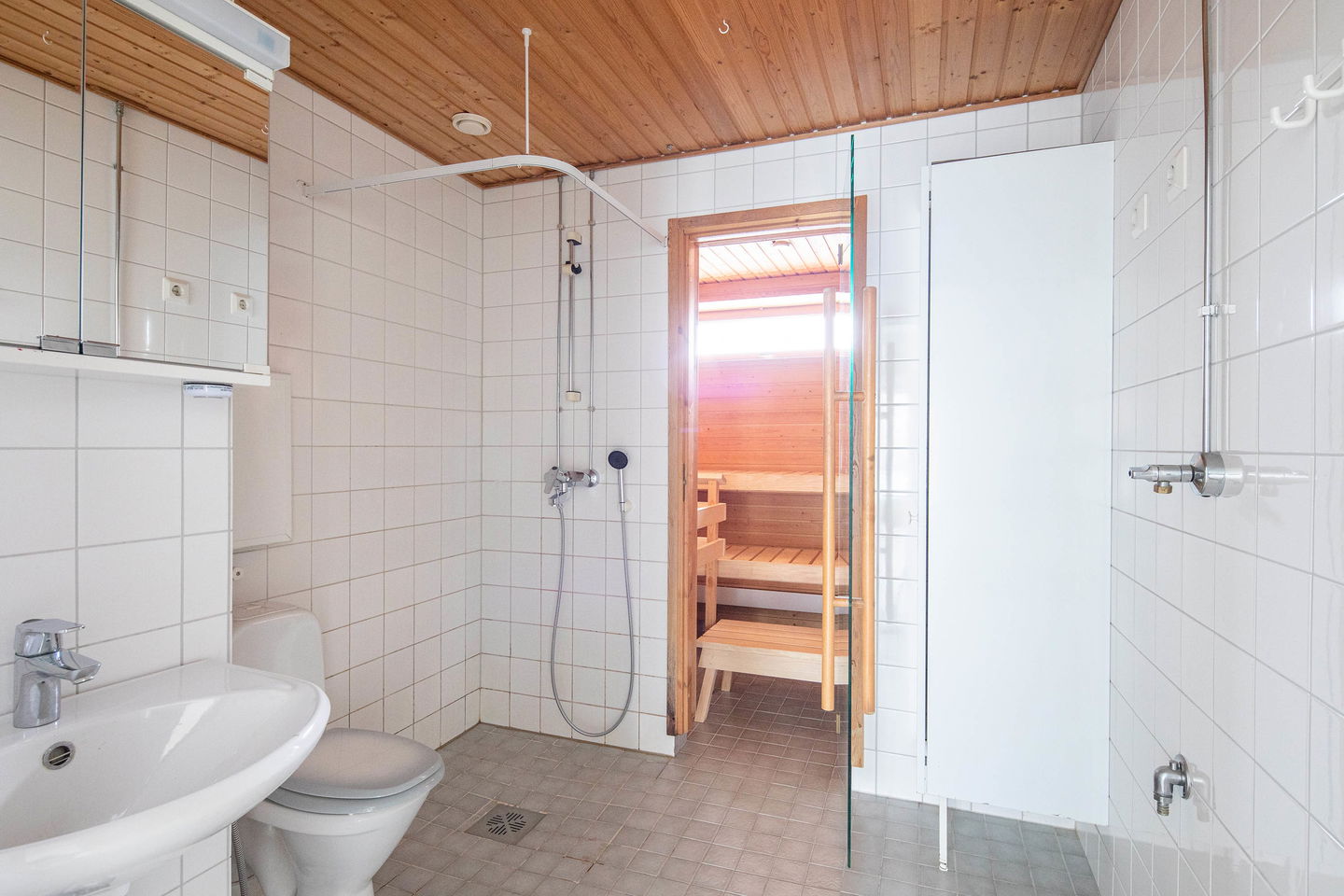 Asunnossa on kolme makuuhuonetta, jotka sijaitsevat vierekkäin omassa rauhallisessa osassaan. Pesuhuone ja sauna on sijoitettu keittiön ja makuuhuoneiden väliin, mikä tekee tilankäytöstä käytännöllistä. Pohjaratkaisu on selkeä ja toimiva, ja se yhdistää avarat yhteiset tilat sekä yksityisyyttä tarjoavat makuuhuoneet.
