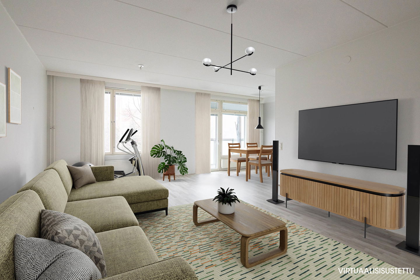 Asunto on 92 m² kokoinen ja siinä on keittiö, olohuone, kolme makuuhuonetta sekä kylpyhuone ja sauna.